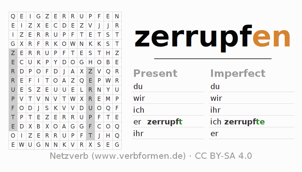 With these search word puzzles you can learn the conjugation of the German verb zerrupfen.