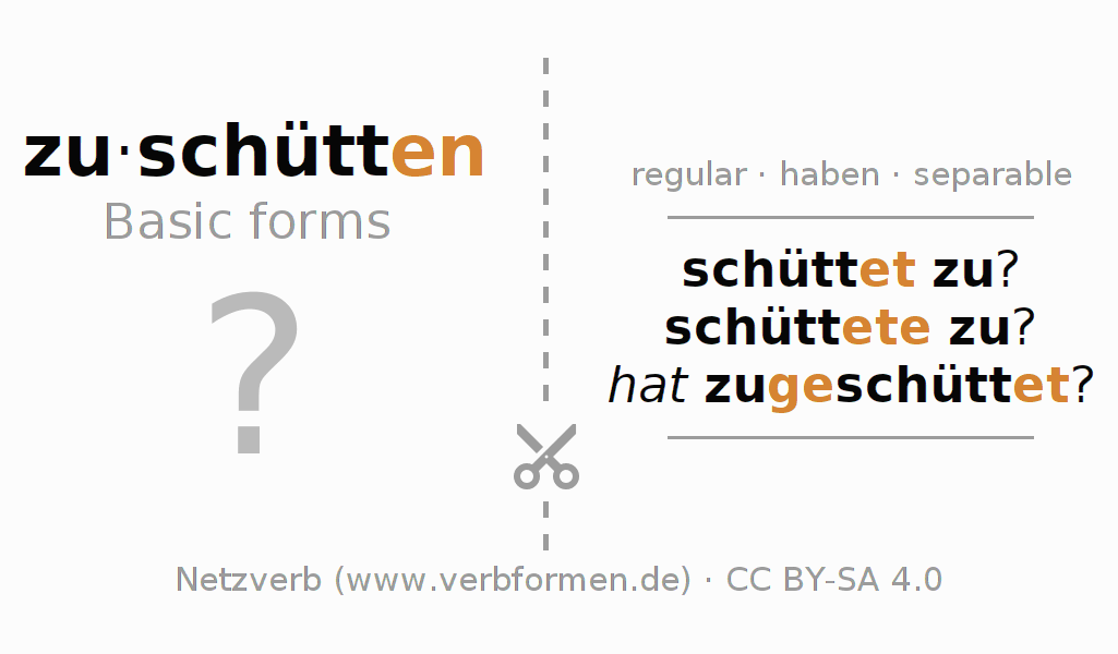 Worksheets are used generally for the conjugation of the verb zuschütten in teaching. The materials can be used as Open Educational Resources (OER) for exercises, for games and as Tasks (CC BY-SA 4.0). There are many different types of tasks available for the verb zuschütten. These are overview sheets with complete conjugation, puzzles and games that require joint learning. The entire educational material is available for free as a PDF download, as pictures and as an interactive browser version. In addition to the tasks, countless examples for zuschütten also provide an aid to using the verb.