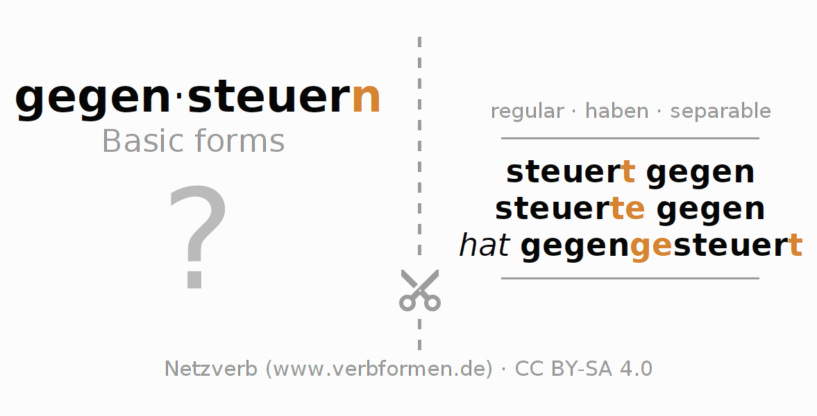 Worksheets are used generally for the conjugation of the verb gegensteuern in teaching. The materials can be used as Open Educational Resources (OER) for exercises, for games and as Tasks (CC BY-SA 4.0). There are many different types of tasks available for the verb gegensteuern. These are overview sheets with complete conjugation, puzzles and games that require joint learning. The entire educational material is available for free as a PDF download, as pictures and as an interactive browser version. In addition to the tasks, countless examples for gegensteuern also provide an aid to using the verb.