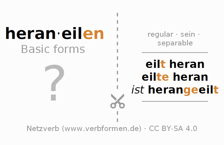 Worksheets are used generally for the conjugation of the verb heraneilen in teaching. The materials can be used as Open Educational Resources (OER) for exercises, for games and as Tasks (CC BY-SA 4.0). There are many different types of tasks available for the verb heraneilen. These are overview sheets with complete conjugation, puzzles and games that require joint learning. The entire educational material is available for free as a PDF download, as pictures and as an interactive browser version. In addition to the tasks, countless examples for heraneilen also provide an aid to using the verb.