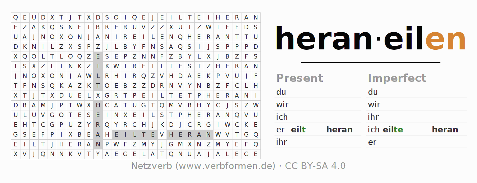 With these search word puzzles you can learn the conjugation of the German verb heraneilen.