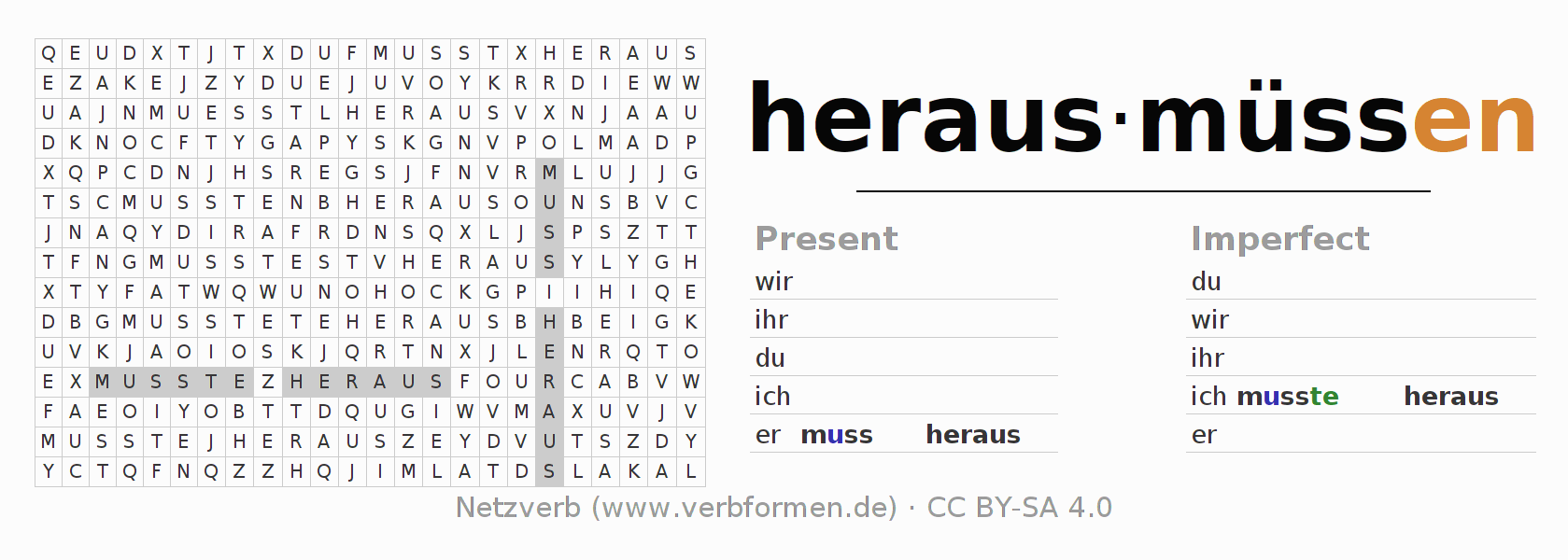 With these search word puzzles you can learn the conjugation of the German verb herausmüssen.