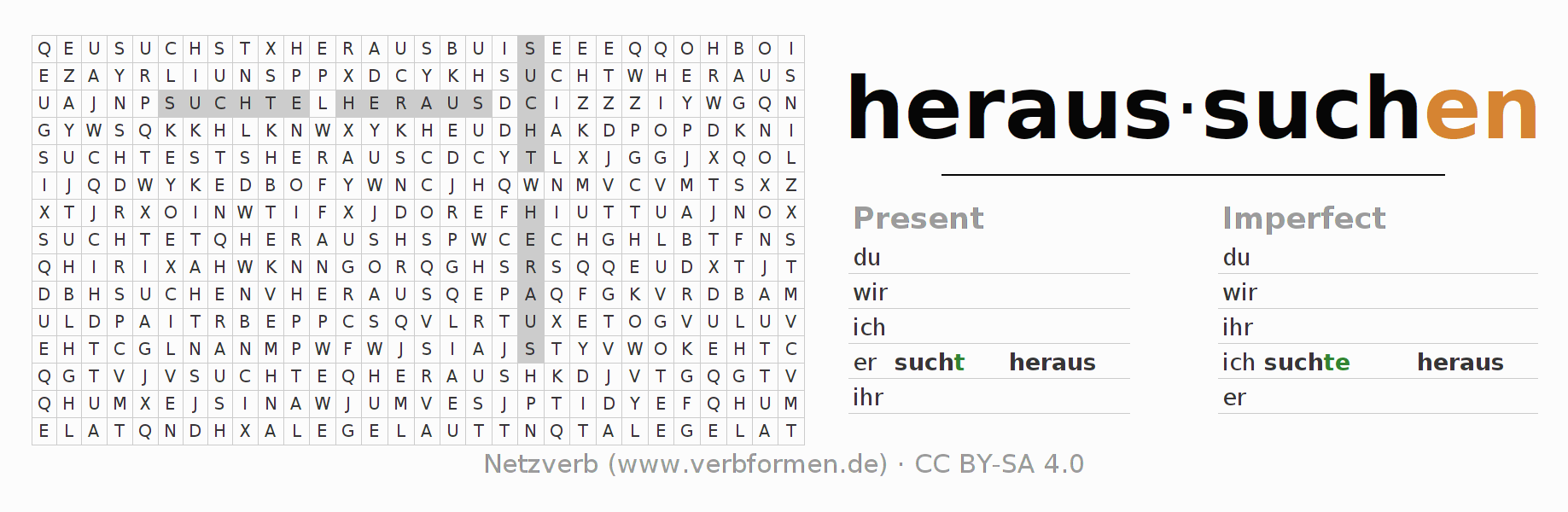 Worksheets are used generally for the conjugation of the verb heraussuchen in teaching. The materials can be used as Open Educational Resources (OER) for exercises, for games and as Tasks (CC BY-SA 4.0). There are many different types of tasks available for the verb heraussuchen. These are overview sheets with complete conjugation, puzzles and games that require joint learning. The entire educational material is available for free as a PDF download, as pictures and as an interactive browser version. In addition to the tasks, countless examples for heraussuchen also provide an aid to using the verb.
