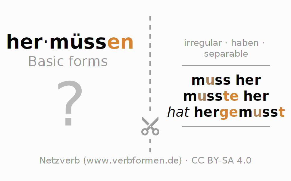 Worksheets are used generally for the conjugation of the verb hermüssen in teaching. The materials can be used as Open Educational Resources (OER) for exercises, for games and as Tasks (CC BY-SA 4.0). There are many different types of tasks available for the verb hermüssen. These are overview sheets with complete conjugation, puzzles and games that require joint learning. The entire educational material is available for free as a PDF download, as pictures and as an interactive browser version. In addition to the tasks, countless examples for hermüssen also provide an aid to using the verb.