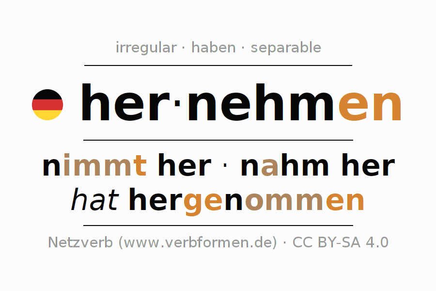 Worksheets are used generally for the conjugation of the verb hernehmen in teaching. The materials can be used as Open Educational Resources (OER) for exercises, for games and as Tasks (CC BY-SA 4.0). There are many different types of tasks available for the verb hernehmen. These are overview sheets with complete conjugation, puzzles and games that require joint learning. The entire educational material is available for free as a PDF download, as pictures and as an interactive browser version. In addition to the tasks, countless examples for hernehmen also provide an aid to using the verb.