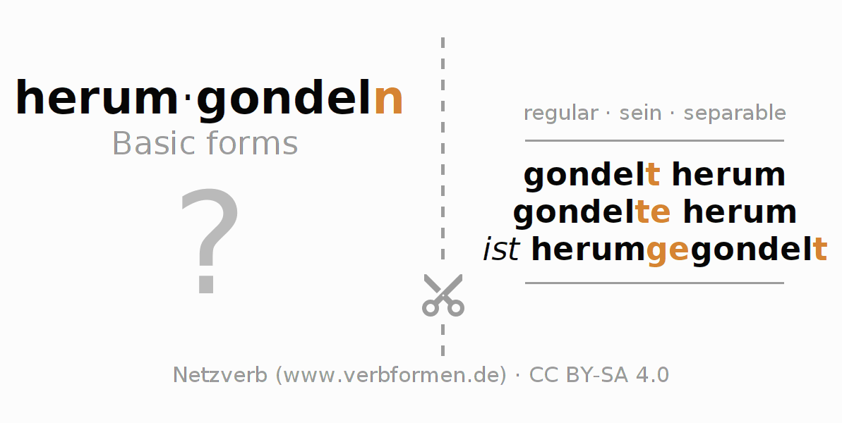 Worksheets are used generally for the conjugation of the verb herumgondeln in teaching. The materials can be used as Open Educational Resources (OER) for exercises, for games and as Tasks (CC BY-SA 4.0). There are many different types of tasks available for the verb herumgondeln. These are overview sheets with complete conjugation, puzzles and games that require joint learning. The entire educational material is available for free as a PDF download, as pictures and as an interactive browser version. In addition to the tasks, countless examples for herumgondeln also provide an aid to using the verb.