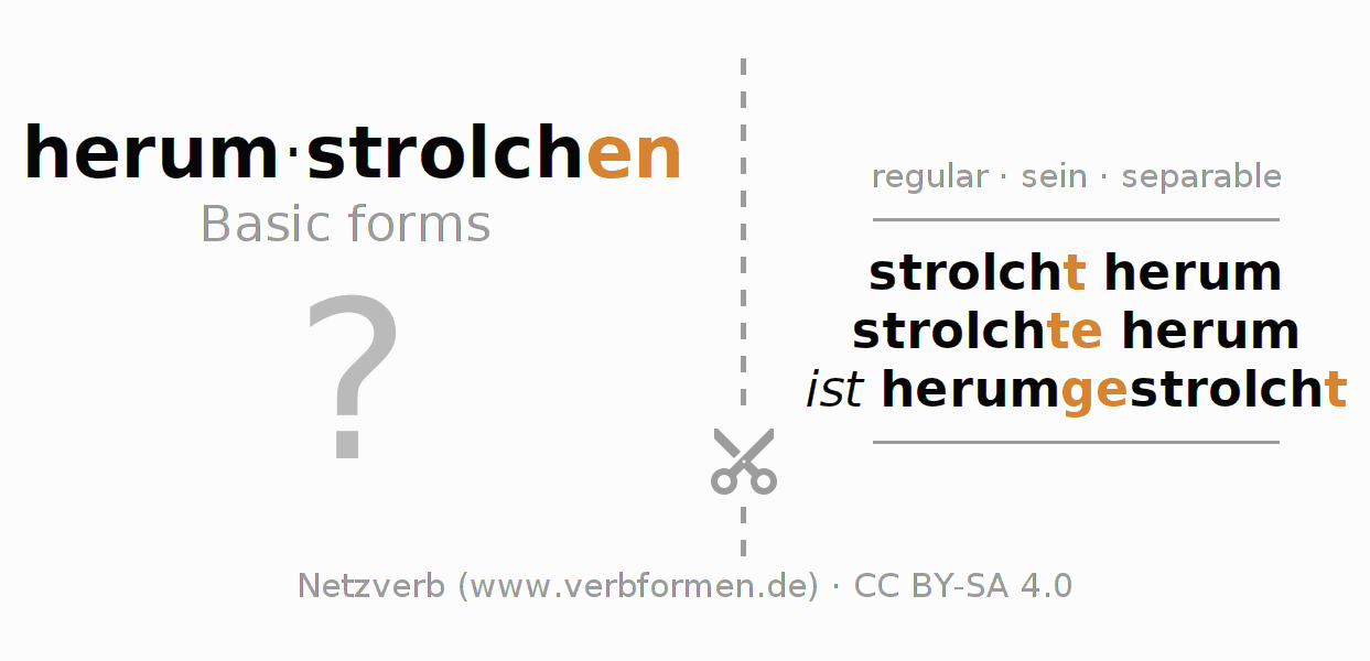 Worksheets are used generally for the conjugation of the verb herumstrolchen in teaching. The materials can be used as Open Educational Resources (OER) for exercises, for games and as Tasks (CC BY-SA 4.0). There are many different types of tasks available for the verb herumstrolchen. These are overview sheets with complete conjugation, puzzles and games that require joint learning. The entire educational material is available for free as a PDF download, as pictures and as an interactive browser version. In addition to the tasks, countless examples for herumstrolchen also provide an aid to using the verb.