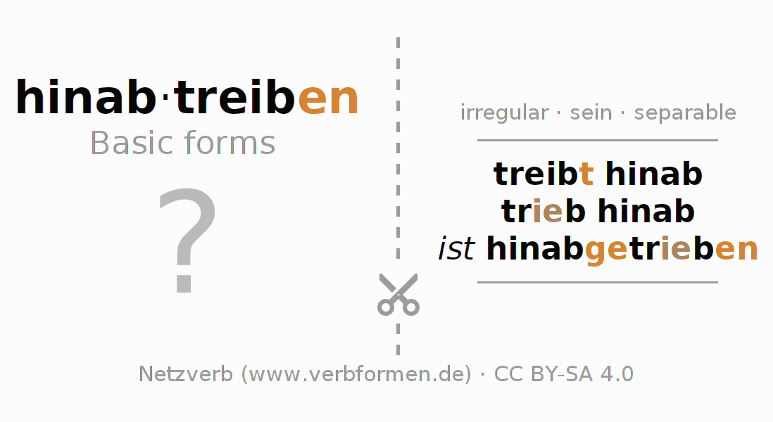 Worksheets are used generally for the conjugation of the verb hinabtreiben in teaching. The materials can be used as Open Educational Resources (OER) for exercises, for games and as Tasks (CC BY-SA 4.0). There are many different types of tasks available for the verb hinabtreiben. These are overview sheets with complete conjugation, puzzles and games that require joint learning. The entire educational material is available for free as a PDF download, as pictures and as an interactive browser version. In addition to the tasks, countless examples for hinabtreiben also provide an aid to using the verb.