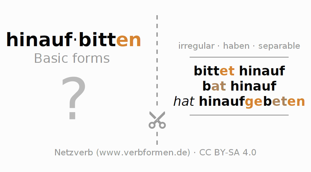 Worksheets are used generally for the conjugation of the verb hinaufbitten in teaching. The materials can be used as Open Educational Resources (OER) for exercises, for games and as Tasks (CC BY-SA 4.0). There are many different types of tasks available for the verb hinaufbitten. These are overview sheets with complete conjugation, puzzles and games that require joint learning. The entire educational material is available for free as a PDF download, as pictures and as an interactive browser version. In addition to the tasks, countless examples for hinaufbitten also provide an aid to using the verb.
