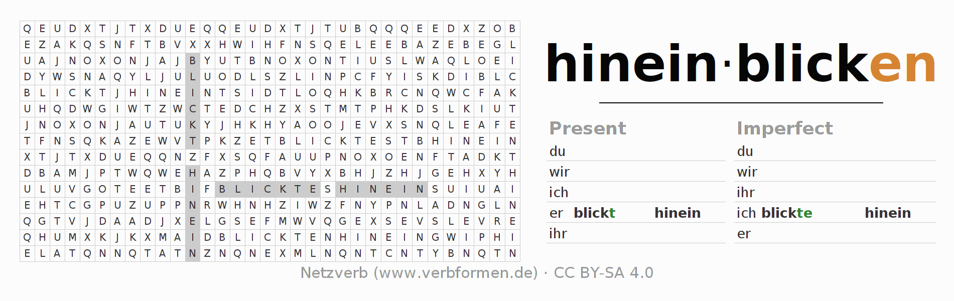 Worksheets are used generally for the conjugation of the verb hineinblicken in teaching. The materials can be used as Open Educational Resources (OER) for exercises, for games and as Tasks (CC BY-SA 4.0). There are many different types of tasks available for the verb hineinblicken. These are overview sheets with complete conjugation, puzzles and games that require joint learning. The entire educational material is available for free as a PDF download, as pictures and as an interactive browser version. In addition to the tasks, countless examples for hineinblicken also provide an aid to using the verb.