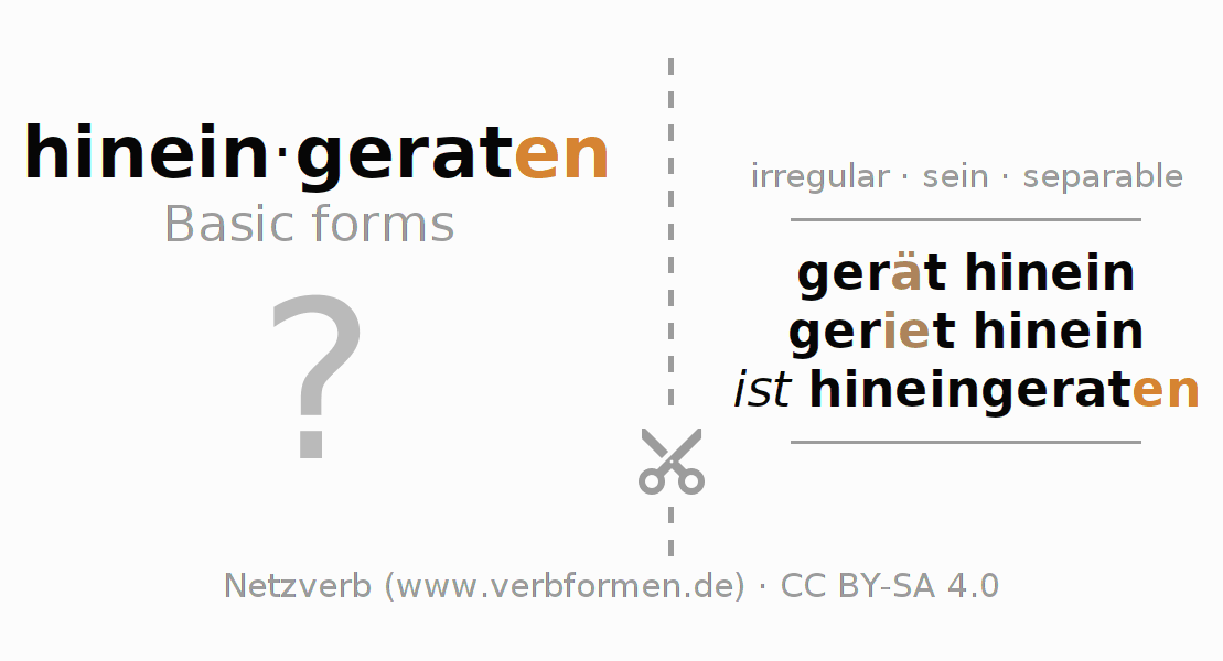 Worksheets are used generally for the conjugation of the verb hineingeraten in teaching. The materials can be used as Open Educational Resources (OER) for exercises, for games and as Tasks (CC BY-SA 4.0). There are many different types of tasks available for the verb hineingeraten. These are overview sheets with complete conjugation, puzzles and games that require joint learning. The entire educational material is available for free as a PDF download, as pictures and as an interactive browser version. In addition to the tasks, countless examples for hineingeraten also provide an aid to using the verb.