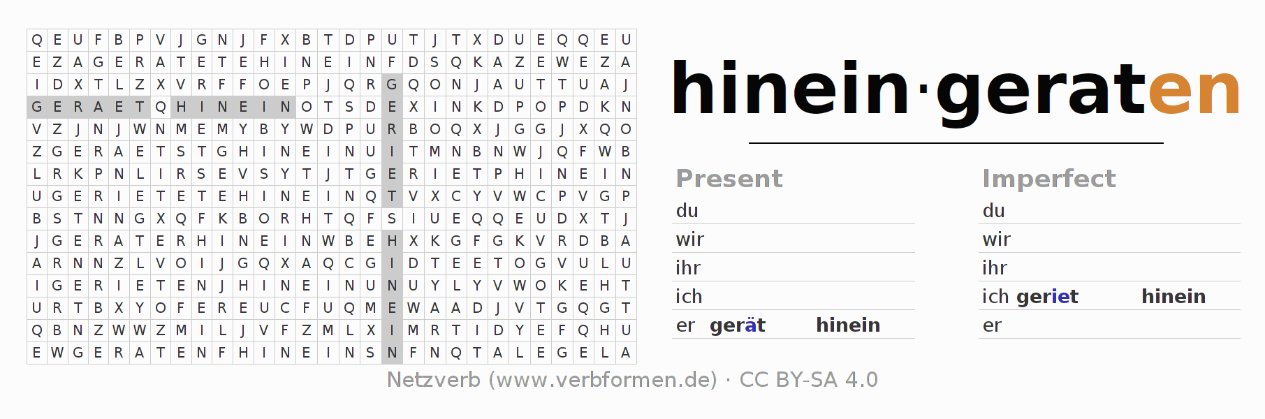 With these search word puzzles you can learn the conjugation of the German verb hineingeraten.