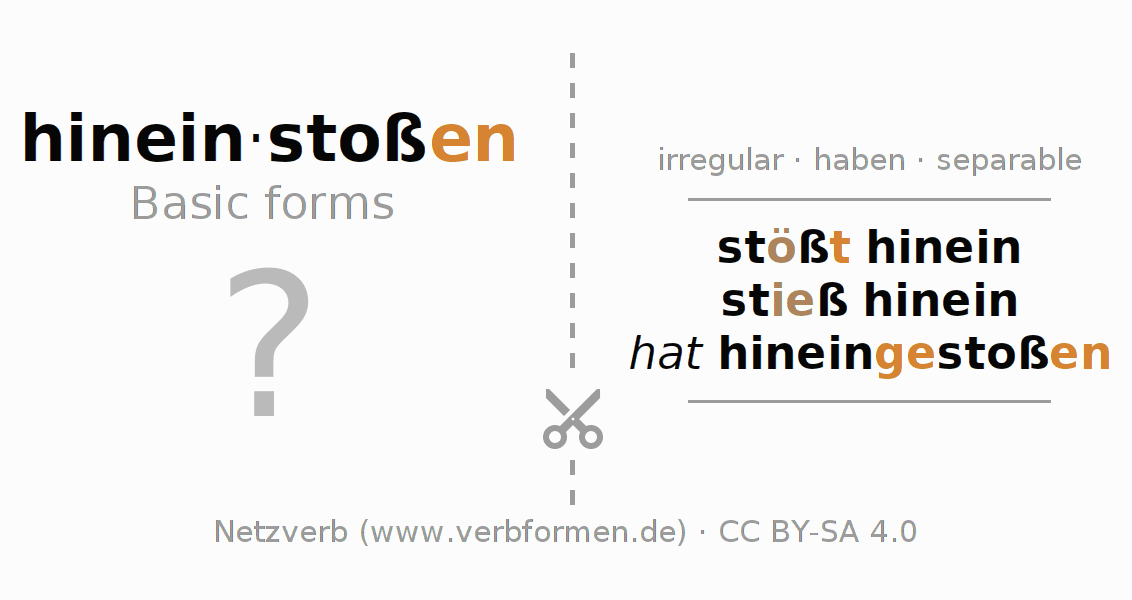 Worksheets are used generally for the conjugation of the verb hineinstoßen in teaching. The materials can be used as Open Educational Resources (OER) for exercises, for games and as Tasks (CC BY-SA 4.0). There are many different types of tasks available for the verb hineinstoßen. These are overview sheets with complete conjugation, puzzles and games that require joint learning. The entire educational material is available for free as a PDF download, as pictures and as an interactive browser version. In addition to the tasks, countless examples for hineinstoßen also provide an aid to using the verb.