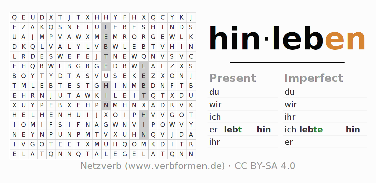 Worksheets are used generally for the conjugation of the verb hinleben in teaching. The materials can be used as Open Educational Resources (OER) for exercises, for games and as Tasks (CC BY-SA 4.0). There are many different types of tasks available for the verb hinleben. These are overview sheets with complete conjugation, puzzles and games that require joint learning. The entire educational material is available for free as a PDF download, as pictures and as an interactive browser version. In addition to the tasks, countless examples for hinleben also provide an aid to using the verb.
