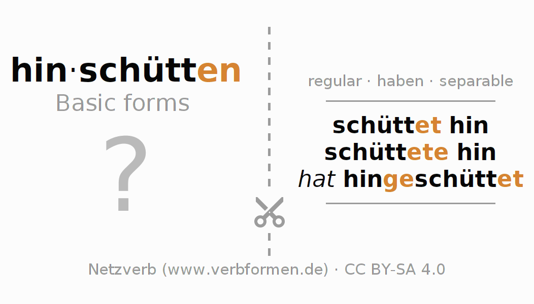 Worksheets are used generally for the conjugation of the verb hinschütten in teaching. The materials can be used as Open Educational Resources (OER) for exercises, for games and as Tasks (CC BY-SA 4.0). There are many different types of tasks available for the verb hinschütten. These are overview sheets with complete conjugation, puzzles and games that require joint learning. The entire educational material is available for free as a PDF download, as pictures and as an interactive browser version. In addition to the tasks, countless examples for hinschütten also provide an aid to using the verb.