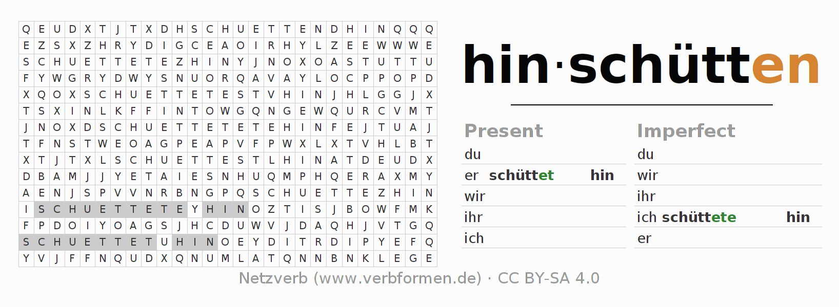With these search word puzzles you can learn the conjugation of the German verb hinschütten.