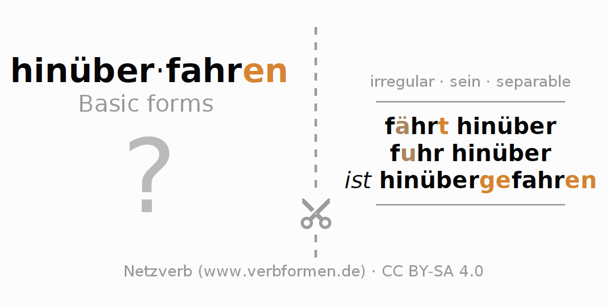 Worksheets are used generally for the conjugation of the verb hinüberfahren in teaching. The materials can be used as Open Educational Resources (OER) for exercises, for games and as Tasks (CC BY-SA 4.0). There are many different types of tasks available for the verb hinüberfahren (ist). These are overview sheets with complete conjugation, puzzles and games that require joint learning. The entire educational material is available for free as a PDF download, as pictures and as an interactive browser version. In addition to the tasks, countless examples for hinüberfahren also provide an aid to using the verb.