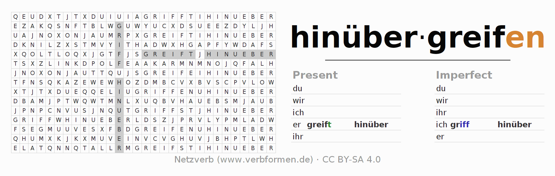 With these search word puzzles you can learn the conjugation of the German verb hinübergreifen.