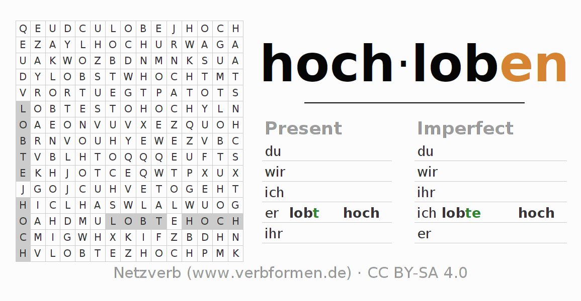 Worksheets are used generally for the conjugation of the verb hochloben in teaching. The materials can be used as Open Educational Resources (OER) for exercises, for games and as Tasks (CC BY-SA 4.0). There are many different types of tasks available for the verb hochloben. These are overview sheets with complete conjugation, puzzles and games that require joint learning. The entire educational material is available for free as a PDF download, as pictures and as an interactive browser version. In addition to the tasks, countless examples for hochloben also provide an aid to using the verb.