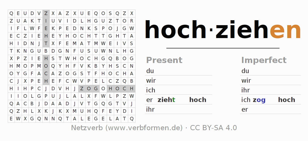 With these search word puzzles you can learn the conjugation of the German verb hochziehen.
