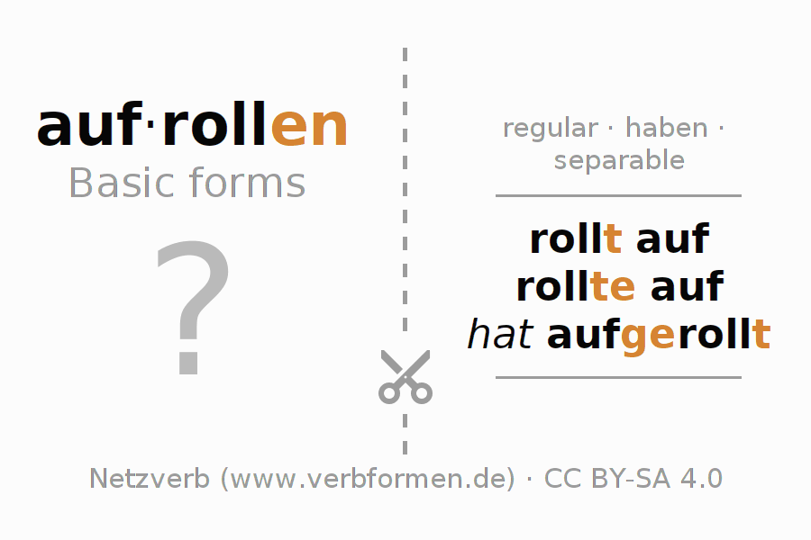 With the flash cards the conjugation of the German verbs can be learned and trained. To do this, follow the tasks on the learning sheets for the verb aufrollen. The required verb forms must be solved in the head. They are then compared with the hints on the cards. If agree, you confirm your learning result. If there is a deviation, you should use the hints to memorize the unknown forms. Typically, print the PDF file of the learning cards and fold them as specified. So you can use them on a stack with other verbs for learning. There are also many more worksheets for the verb aufrollen. All materials are available as Open Educational Resources (OER) under license CC BY- SA 4.0 and can be used free of charge.