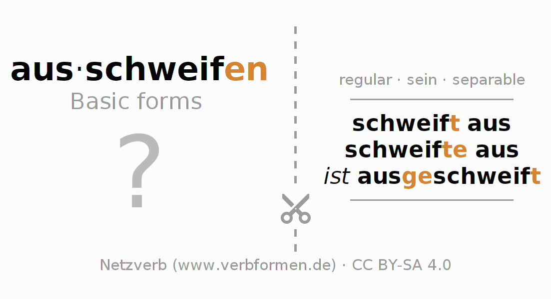 With the flash cards the conjugation of the German verbs can be learned and trained. To do this, follow the tasks on the learning sheets for the verb ausschweifen. The required verb forms must be solved in the head. They are then compared with the hints on the cards. If agree, you confirm your learning result. If there is a deviation, you should use the hints to memorize the unknown forms. Typically, print the PDF file of the learning cards and fold them as specified. So you can use them on a stack with other verbs for learning. There are also many more worksheets for the verb ausschweifen. All materials are available as Open Educational Resources (OER) under license CC BY- SA 4.0 and can be used free of charge.