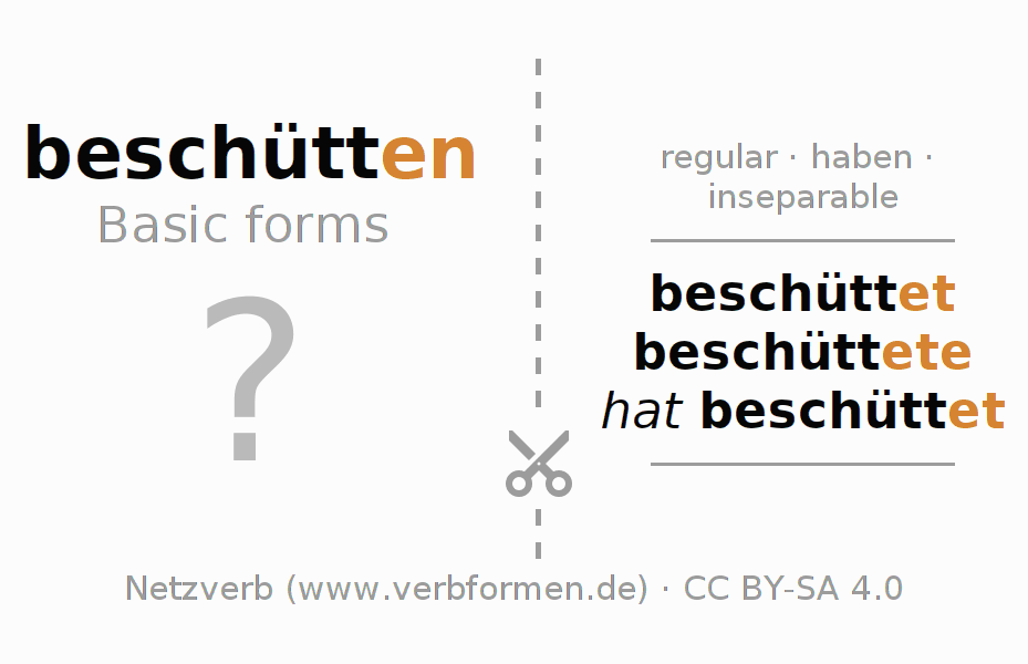 With the flash cards the conjugation of the German verbs can be learned and trained. To do this, follow the tasks on the learning sheets for the verb beschütten. The required verb forms must be solved in the head. They are then compared with the hints on the cards. If agree, you confirm your learning result. If there is a deviation, you should use the hints to memorize the unknown forms. Typically, print the PDF file of the learning cards and fold them as specified. So you can use them on a stack with other verbs for learning. There are also many more worksheets for the verb beschütten. All materials are available as Open Educational Resources (OER) under license CC BY- SA 4.0 and can be used free of charge.