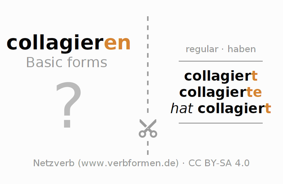 With the flash cards the conjugation of the German verbs can be learned and trained. To do this, follow the tasks on the learning sheets for the verb collagieren. The required verb forms must be solved in the head. They are then compared with the hints on the cards. If agree, you confirm your learning result. If there is a deviation, you should use the hints to memorize the unknown forms. Typically, print the PDF file of the learning cards and fold them as specified. So you can use them on a stack with other verbs for learning. There are also many more worksheets for the verb collagieren. All materials are available as Open Educational Resources (OER) under license CC BY- SA 4.0 and can be used free of charge.