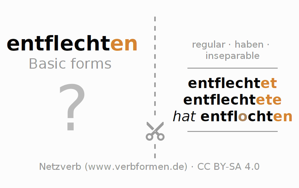 With the flash cards the conjugation of the German verbs can be learned and trained. To do this, follow the tasks on the learning sheets for the verb entflechten. The required verb forms must be solved in the head. They are then compared with the hints on the cards. If agree, you confirm your learning result. If there is a deviation, you should use the hints to memorize the unknown forms. Typically, print the PDF file of the learning cards and fold them as specified. So you can use them on a stack with other verbs for learning. There are also many more worksheets for the verb entflechten. All materials are available as Open Educational Resources (OER) under license CC BY- SA 4.0 and can be used free of charge.