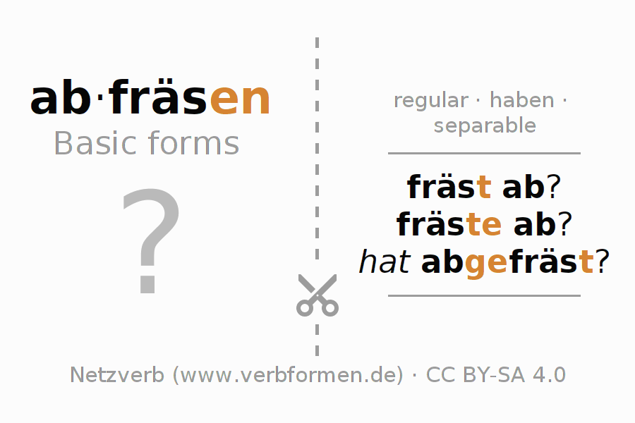 With the flash cards the conjugation of the German verbs can be learned and trained. To do this, follow the tasks on the learning sheets for the verb abfräsen. The required verb forms must be solved in the head. They are then compared with the hints on the cards. If agree, you confirm your learning result. If there is a deviation, you should use the hints to memorize the unknown forms. Typically, print the PDF file of the learning cards and fold them as specified. So you can use them on a stack with other verbs for learning. There are also many more worksheets for the verb abfräsen. All materials are available as Open Educational Resources (OER) under license CC BY- SA 4.0 and can be used free of charge.