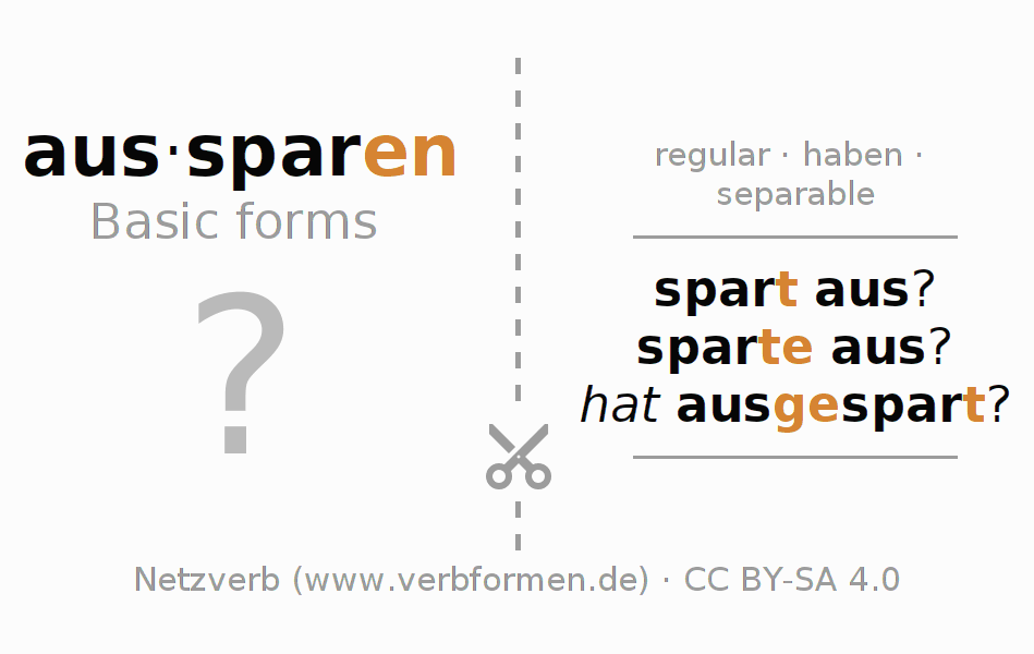 With the flash cards the conjugation of the German verbs can be learned and trained. To do this, follow the tasks on the learning sheets for the verb aussparen. The required verb forms must be solved in the head. They are then compared with the hints on the cards. If agree, you confirm your learning result. If there is a deviation, you should use the hints to memorize the unknown forms. Typically, print the PDF file of the learning cards and fold them as specified. So you can use them on a stack with other verbs for learning. There are also many more worksheets for the verb aussparen. All materials are available as Open Educational Resources (OER) under license CC BY- SA 4.0 and can be used free of charge.