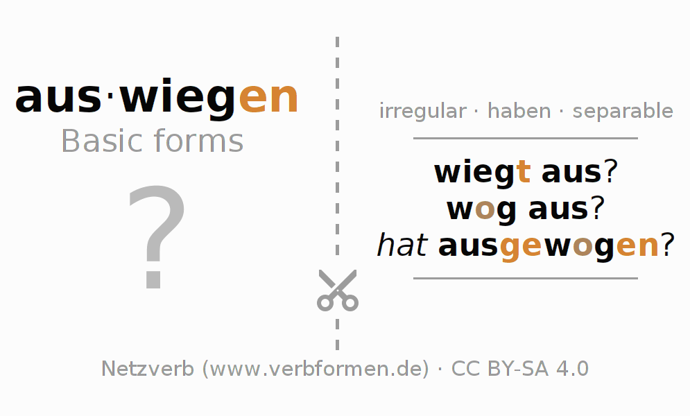 With the flash cards the conjugation of the German verbs can be learned and trained. To do this, follow the tasks on the learning sheets for the verb auswiegen. The required verb forms must be solved in the head. They are then compared with the hints on the cards. If agree, you confirm your learning result. If there is a deviation, you should use the hints to memorize the unknown forms. Typically, print the PDF file of the learning cards and fold them as specified. So you can use them on a stack with other verbs for learning. There are also many more worksheets for the verb auswiegen. All materials are available as Open Educational Resources (OER) under license CC BY- SA 4.0 and can be used free of charge.