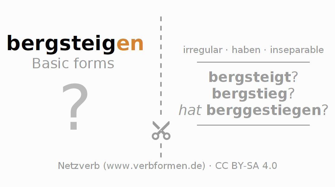 Instruction: Print and cut the learning cards of the bergsteigen. Then place the individual cards for several verbs on a pile and mix. Now the cards can be drawn. The information on the cards must be read in memory. To match your solution, use the information on the learning sheets.