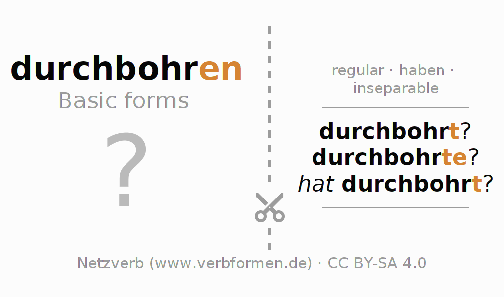 With the flash cards the conjugation of the German verbs can be learned and trained. To do this, follow the tasks on the learning sheets for the verb durchbohren. The required verb forms must be solved in the head. They are then compared with the hints on the cards. If agree, you confirm your learning result. If there is a deviation, you should use the hints to memorize the unknown forms. Typically, print the PDF file of the learning cards and fold them as specified. So you can use them on a stack with other verbs for learning. There are also many more worksheets for the verb durchbohren. All materials are available as Open Educational Resources (OER) under license CC BY- SA 4.0 and can be used free of charge.