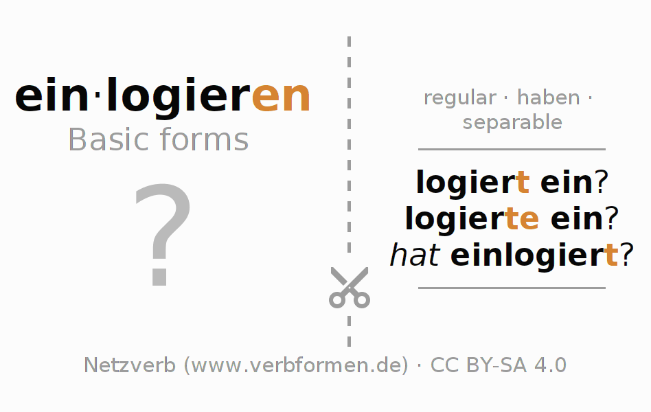 With the flash cards the conjugation of the German verbs can be learned and trained. To do this, follow the tasks on the learning sheets for the verb einlogieren. The required verb forms must be solved in the head. They are then compared with the hints on the cards. If agree, you confirm your learning result. If there is a deviation, you should use the hints to memorize the unknown forms. Typically, print the PDF file of the learning cards and fold them as specified. So you can use them on a stack with other verbs for learning. There are also many more worksheets for the verb einlogieren. All materials are available as Open Educational Resources (OER) under license CC BY- SA 4.0 and can be used free of charge.