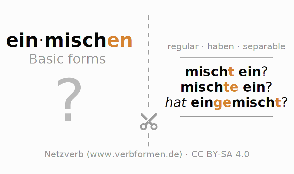 With the flash cards the conjugation of the German verbs can be learned and trained. To do this, follow the tasks on the learning sheets for the verb einmischen. The required verb forms must be solved in the head. They are then compared with the hints on the cards. If agree, you confirm your learning result. If there is a deviation, you should use the hints to memorize the unknown forms. Typically, print the PDF file of the learning cards and fold them as specified. So you can use them on a stack with other verbs for learning. There are also many more worksheets for the verb einmischen. All materials are available as Open Educational Resources (OER) under license CC BY- SA 4.0 and can be used free of charge.