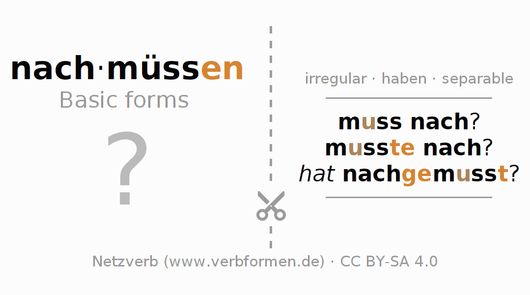 Instruction: Print and cut the learning cards of the nachmüssen. Then place the individual cards for several verbs on a pile and mix. Now the cards can be drawn. The information on the cards must be read in memory. To match your solution, use the information on the learning sheets.