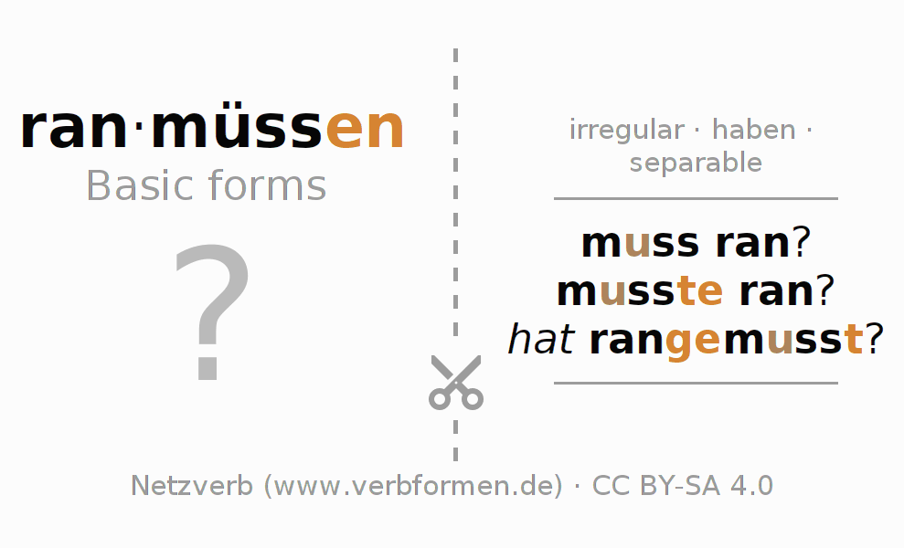 With the flash cards the conjugation of the German verbs can be learned and trained. To do this, follow the tasks on the learning sheets for the verb ranmüssen. The required verb forms must be solved in the head. They are then compared with the hints on the cards. If agree, you confirm your learning result. If there is a deviation, you should use the hints to memorize the unknown forms. Typically, print the PDF file of the learning cards and fold them as specified. So you can use them on a stack with other verbs for learning. There are also many more worksheets for the verb ranmüssen. All materials are available as Open Educational Resources (OER) under license CC BY- SA 4.0 and can be used free of charge.