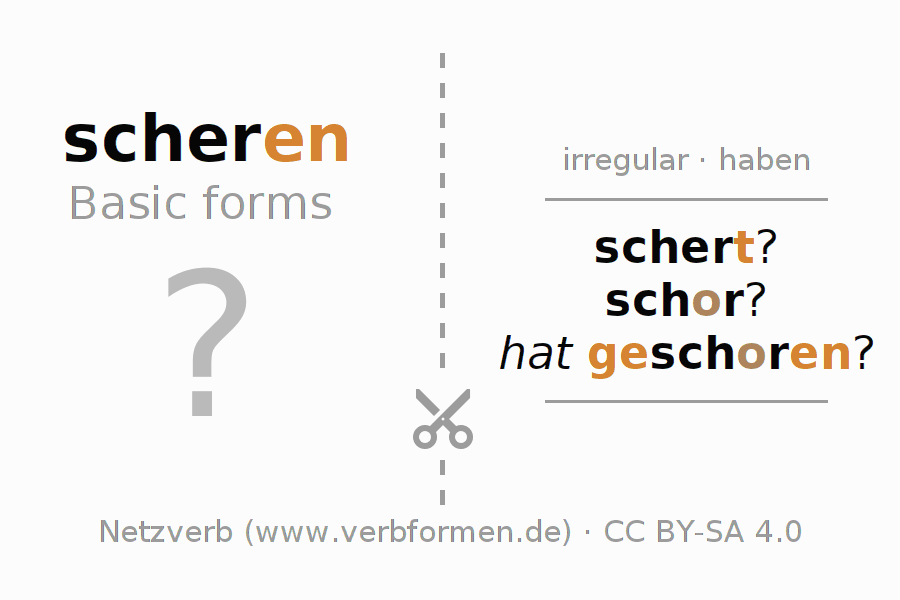 With the flash cards the conjugation of the German verbs can be learned and trained. To do this, follow the tasks on the learning sheets for the verb scheren. The required verb forms must be solved in the head. They are then compared with the hints on the cards. If agree, you confirm your learning result. If there is a deviation, you should use the hints to memorize the unknown forms. Typically, print the PDF file of the learning cards and fold them as specified. So you can use them on a stack with other verbs for learning. There are also many more worksheets for the verb scheren. All materials are available as Open Educational Resources (OER) under license CC BY- SA 4.0 and can be used free of charge.
