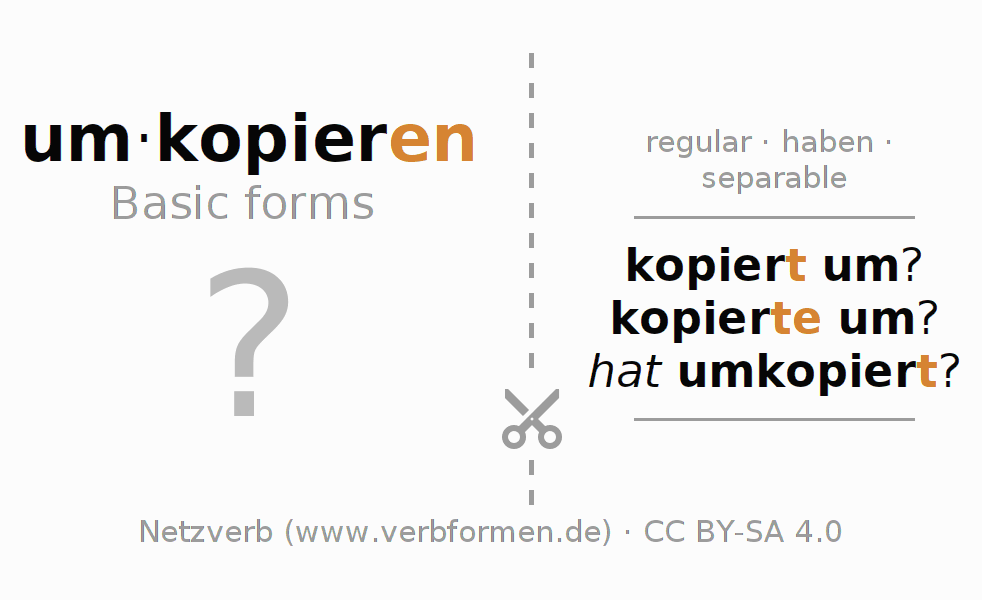 With the flash cards the conjugation of the German verbs can be learned and trained. To do this, follow the tasks on the learning sheets for the verb umkopieren. The required verb forms must be solved in the head. They are then compared with the hints on the cards. If agree, you confirm your learning result. If there is a deviation, you should use the hints to memorize the unknown forms. Typically, print the PDF file of the learning cards and fold them as specified. So you can use them on a stack with other verbs for learning. There are also many more worksheets for the verb umkopieren. All materials are available as Open Educational Resources (OER) under license CC BY- SA 4.0 and can be used free of charge.