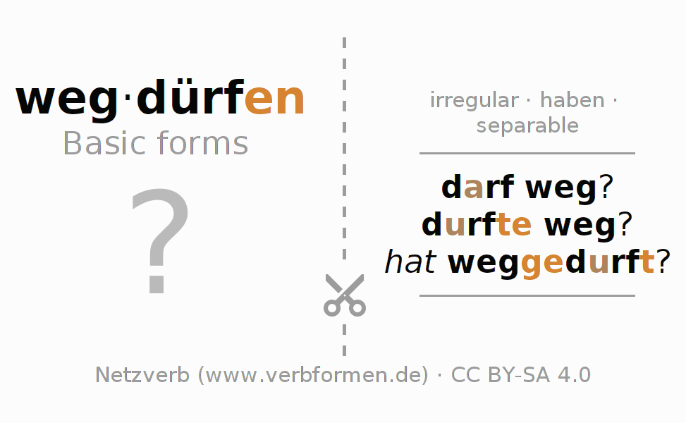 Instruction: Print and cut the learning cards of the wegdürfen. Then place the individual cards for several verbs on a pile and mix. Now the cards can be drawn. The information on the cards must be read in memory. To match your solution, use the information on the learning sheets.