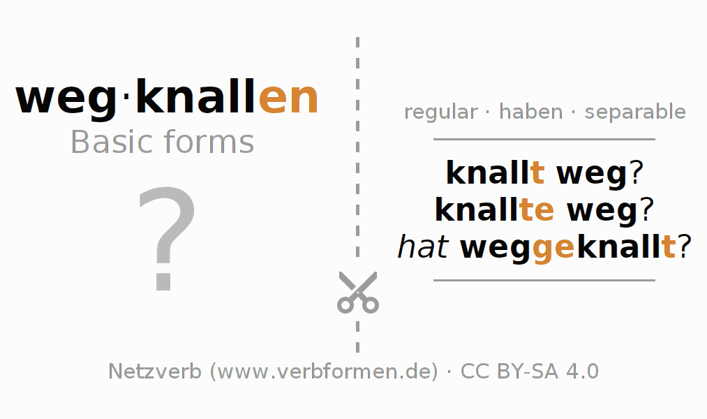With the flash cards the conjugation of the German verbs can be learned and trained. To do this, follow the tasks on the learning sheets for the verb wegknallen. The required verb forms must be solved in the head. They are then compared with the hints on the cards. If agree, you confirm your learning result. If there is a deviation, you should use the hints to memorize the unknown forms. Typically, print the PDF file of the learning cards and fold them as specified. So you can use them on a stack with other verbs for learning. There are also many more worksheets for the verb wegknallen. All materials are available as Open Educational Resources (OER) under license CC BY- SA 4.0 and can be used free of charge.