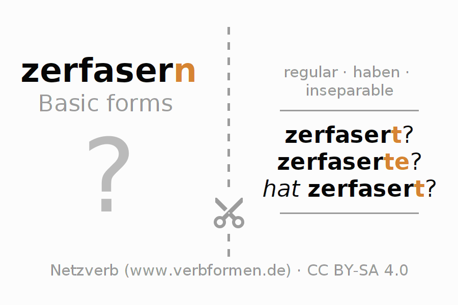 With the flash cards the conjugation of the German verbs can be learned and trained. To do this, follow the tasks on the learning sheets for the verb zerfasern. The required verb forms must be solved in the head. They are then compared with the hints on the cards. If agree, you confirm your learning result. If there is a deviation, you should use the hints to memorize the unknown forms. Typically, print the PDF file of the learning cards and fold them as specified. So you can use them on a stack with other verbs for learning. There are also many more worksheets for the verb zerfasern. All materials are available as Open Educational Resources (OER) under license CC BY- SA 4.0 and can be used free of charge.