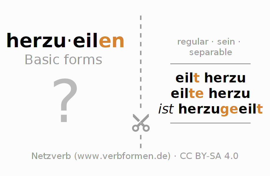 With the flash cards the conjugation of the German verbs can be learned and trained. To do this, follow the tasks on the learning sheets for the verb herzueilen. The required verb forms must be solved in the head. They are then compared with the hints on the cards. If agree, you confirm your learning result. If there is a deviation, you should use the hints to memorize the unknown forms. Typically, print the PDF file of the learning cards and fold them as specified. So you can use them on a stack with other verbs for learning. There are also many more worksheets for the verb herzueilen. All materials are available as Open Educational Resources (OER) under license CC BY- SA 4.0 and can be used free of charge.