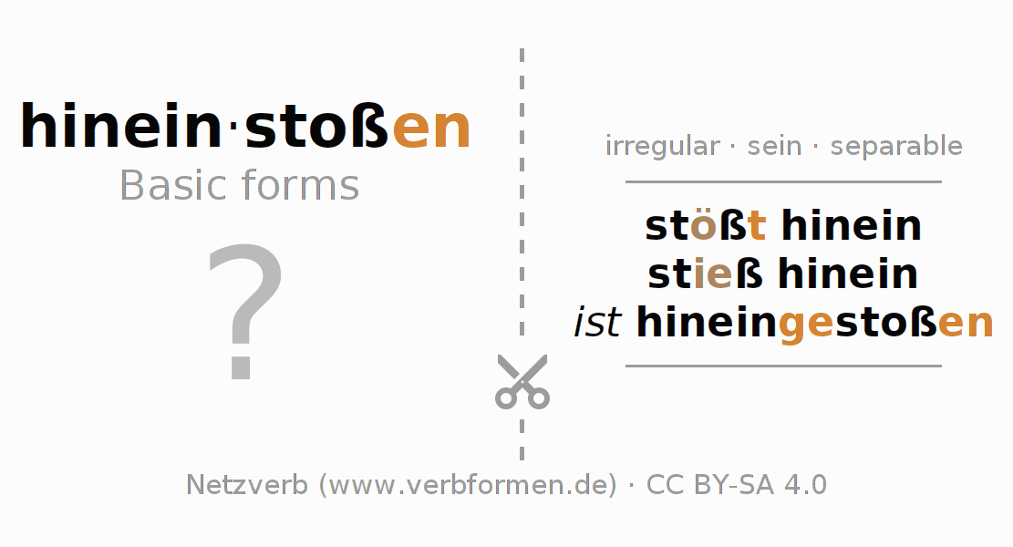 Instruction: Print and cut the learning cards of the hineinstoßen. Then place the individual cards for several verbs on a pile and mix. Now the cards can be drawn. The information on the cards must be read in memory. To match your solution, use the information on the learning sheets.