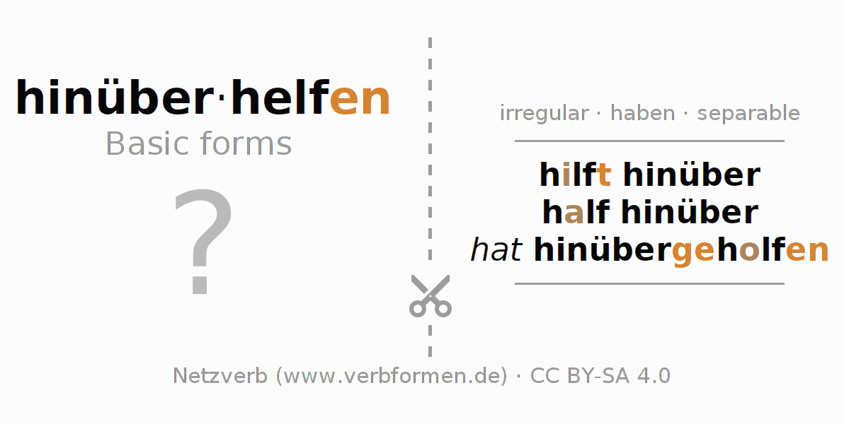 With the flash cards the conjugation of the German verbs can be learned and trained. To do this, follow the tasks on the learning sheets for the verb hinüberhelfen. The required verb forms must be solved in the head. They are then compared with the hints on the cards. If agree, you confirm your learning result. If there is a deviation, you should use the hints to memorize the unknown forms. Typically, print the PDF file of the learning cards and fold them as specified. So you can use them on a stack with other verbs for learning. There are also many more worksheets for the verb hinüberhelfen. All materials are available as Open Educational Resources (OER) under license CC BY- SA 4.0 and can be used free of charge.