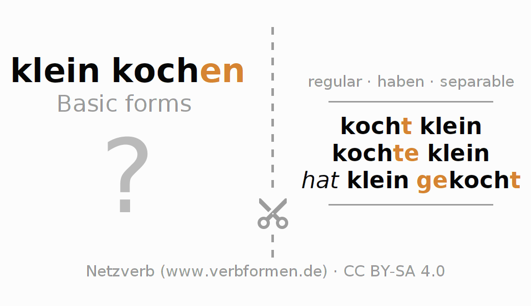 With the flash cards the conjugation of the German verbs can be learned and trained. To do this, follow the tasks on the learning sheets for the verb kleinkochen. The required verb forms must be solved in the head. They are then compared with the hints on the cards. If agree, you confirm your learning result. If there is a deviation, you should use the hints to memorize the unknown forms. Typically, print the PDF file of the learning cards and fold them as specified. So you can use them on a stack with other verbs for learning. There are also many more worksheets for the verb kleinkochen. All materials are available as Open Educational Resources (OER) under license CC BY- SA 4.0 and can be used free of charge.