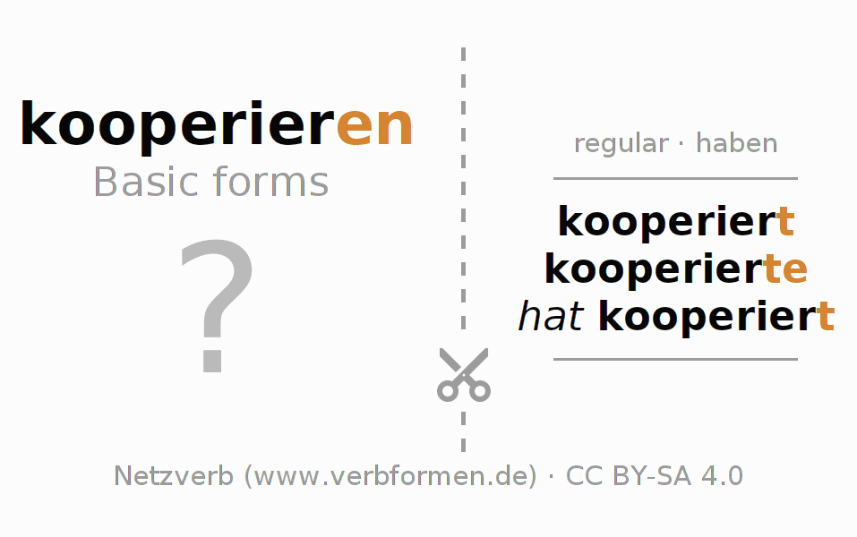 With the flash cards the conjugation of the German verbs can be learned and trained. To do this, follow the tasks on the learning sheets for the verb kooperieren. The required verb forms must be solved in the head. They are then compared with the hints on the cards. If agree, you confirm your learning result. If there is a deviation, you should use the hints to memorize the unknown forms. Typically, print the PDF file of the learning cards and fold them as specified. So you can use them on a stack with other verbs for learning. There are also many more worksheets for the verb kooperieren. All materials are available as Open Educational Resources (OER) under license CC BY- SA 4.0 and can be used free of charge.