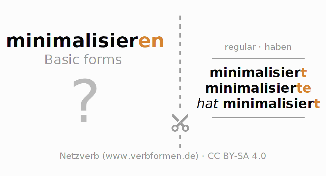 With the flash cards the conjugation of the German verbs can be learned and trained. To do this, follow the tasks on the learning sheets for the verb minimalisieren. The required verb forms must be solved in the head. They are then compared with the hints on the cards. If agree, you confirm your learning result. If there is a deviation, you should use the hints to memorize the unknown forms. Typically, print the PDF file of the learning cards and fold them as specified. So you can use them on a stack with other verbs for learning. There are also many more worksheets for the verb minimalisieren. All materials are available as Open Educational Resources (OER) under license CC BY- SA 4.0 and can be used free of charge.
