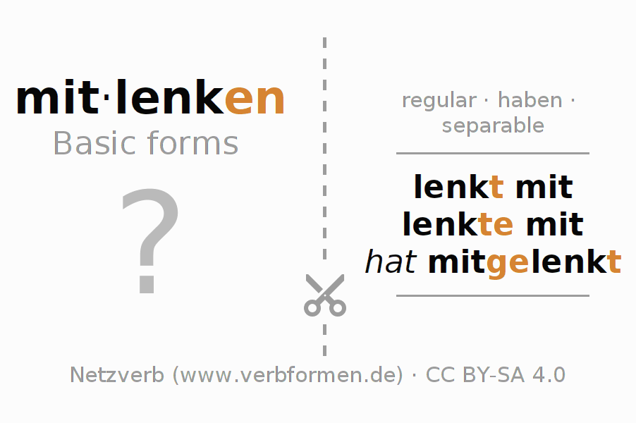With the flash cards the conjugation of the German verbs can be learned and trained. To do this, follow the tasks on the learning sheets for the verb mitlenken. The required verb forms must be solved in the head. They are then compared with the hints on the cards. If agree, you confirm your learning result. If there is a deviation, you should use the hints to memorize the unknown forms. Typically, print the PDF file of the learning cards and fold them as specified. So you can use them on a stack with other verbs for learning. There are also many more worksheets for the verb mitlenken. All materials are available as Open Educational Resources (OER) under license CC BY- SA 4.0 and can be used free of charge.